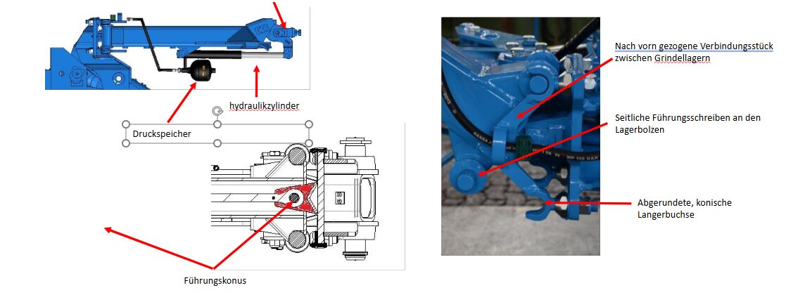 The different blade thicknesses, which vary depending on the plough type, enable optimum adaptation to different operating conditions. The stable design is suitable for all conditions and bodies and ensures reliable use even in heavy and hard soils. The single-sided headstock attachment in combination with the sturdy main bolt and the face-milled flange surfaces ensure a particularly stable fit. The shear bolt with defined predetermined breaking point ensures controlled shearing in the event of overload and thus increases operational safety. Overall, the system guarantees optimum shearing with high operational reliability and a long service life.